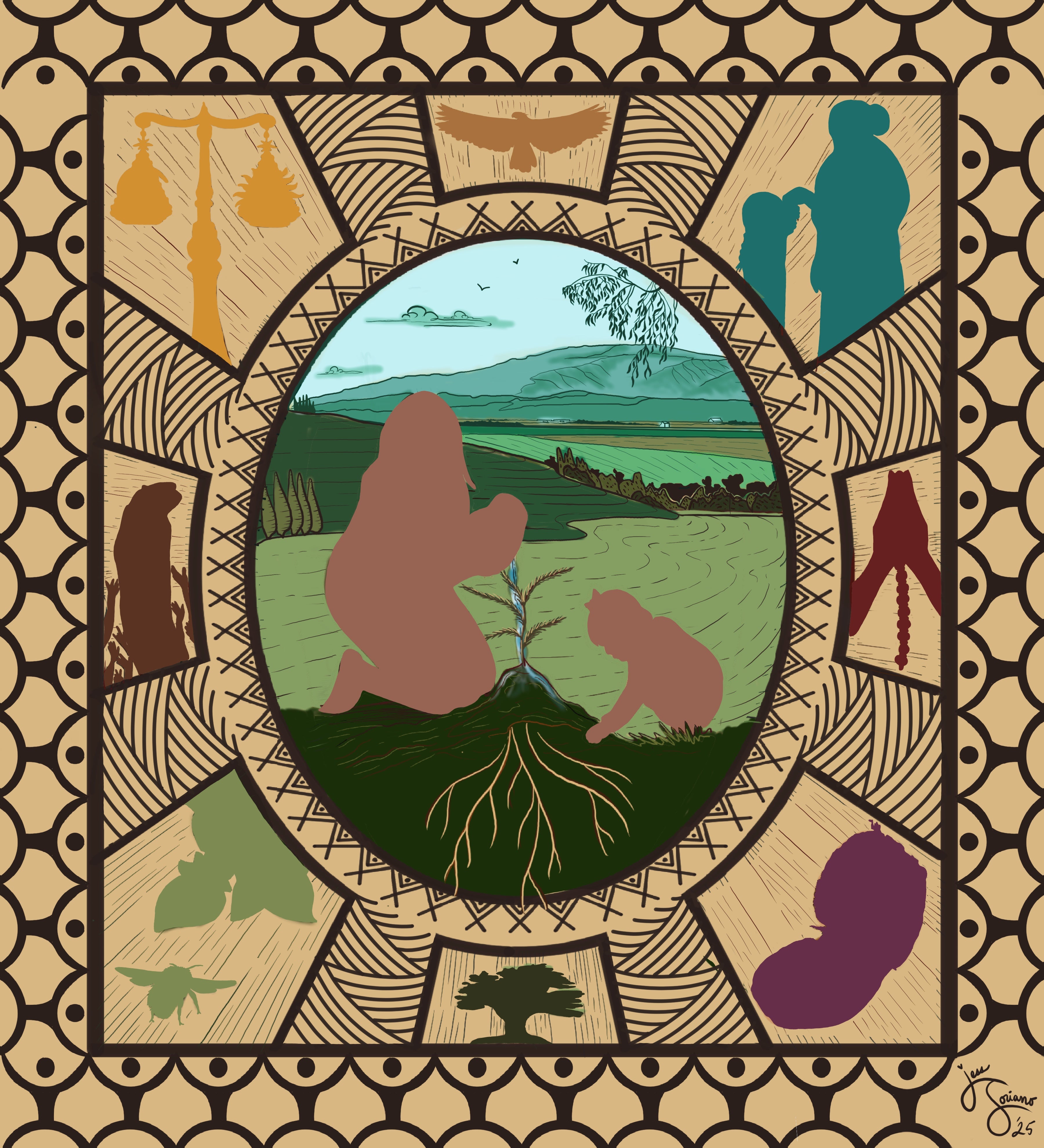 Inspired by woven textiles, printmaking, and storytelling, I decided to create a design that shares a story about life and legacy. There is a long history with Filipino culture in Salinas, CA. A lot of it is blurry, sad, and disheartening, but there are a lot of glimpses of hopefulness, positivity, and resilience. Filipinos helped forged a path for a better environment, and I want to honor them with this mural. By depicting the values of a thriving, positive community using Filipino-inspired symbolism, I’ve created a design where each viewer can engage with each element and find truth, fairness, respect, strength, spiritual growth, unity, love, harmony, and resilience.
