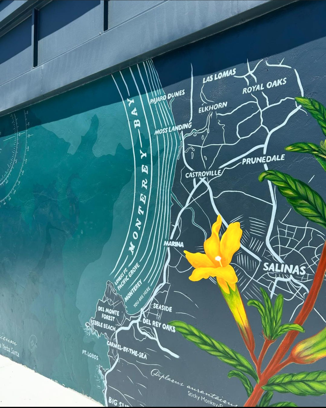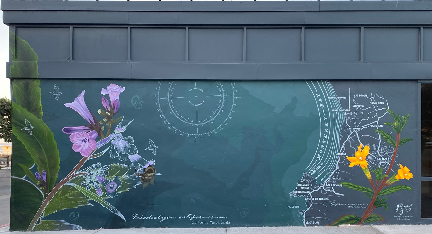 This mural is a dedication to the medicinal, wild, and native plants found along our shores, hills, and rocky in-betweens. I’ve seen almost every plant on a hike. Maybe even some Yerba Santa before it bloomed, but without the flowers, they are a bit easy to overlook. Of course, I had to include a lil symbiotic relationship to connect us 🐝
