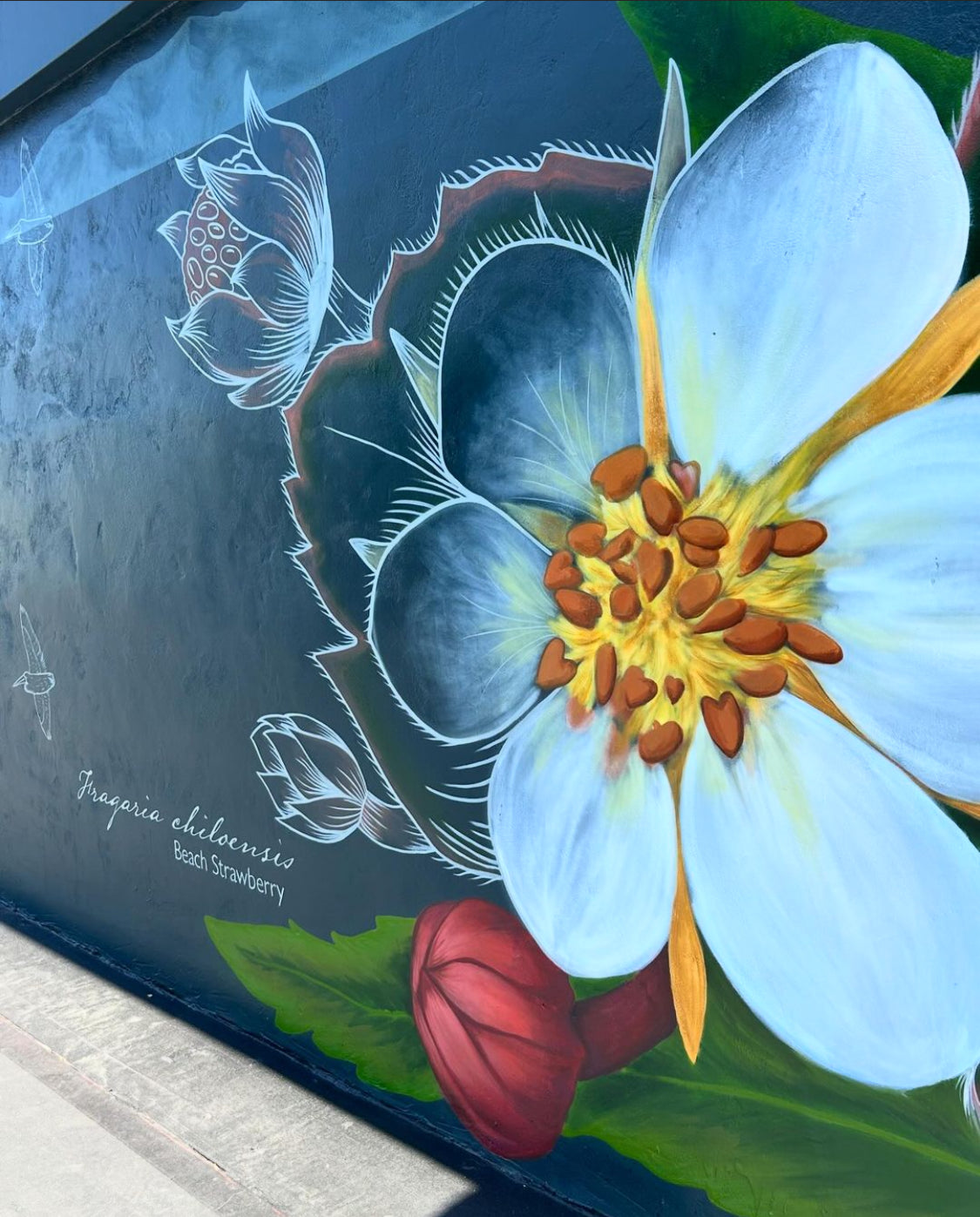 Like Beach Strawberry, Fragaria chiloensis, I’ve found each one on hikes nearby, so this mural encourages the viewer to explore their surroundings so they could find these flowers themselves :)
