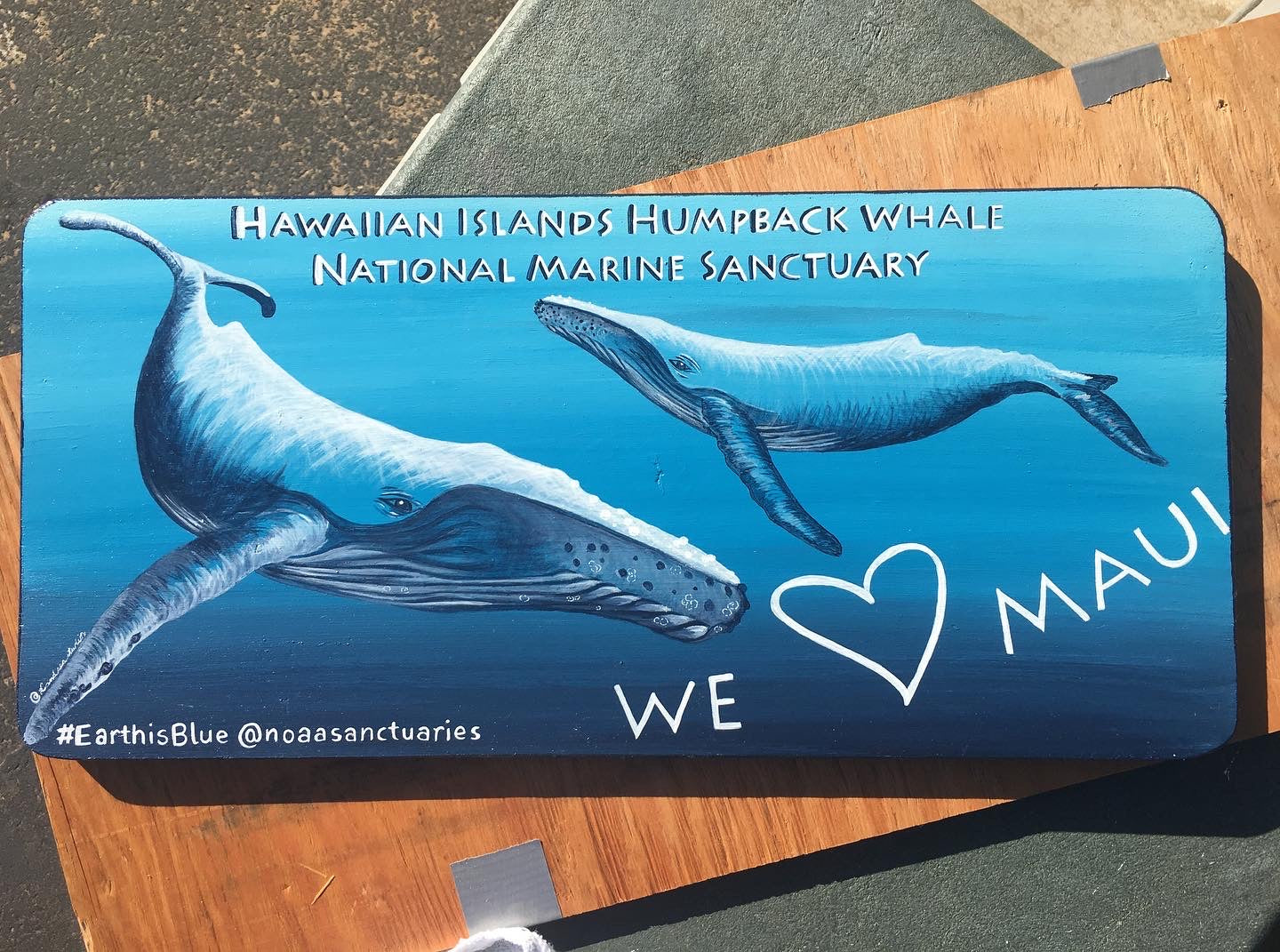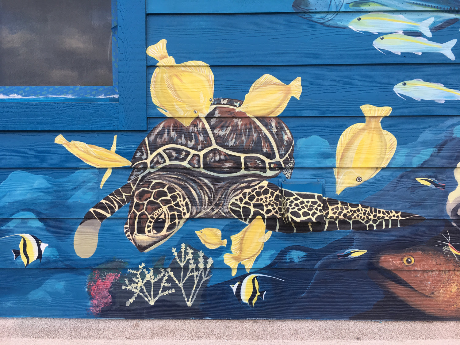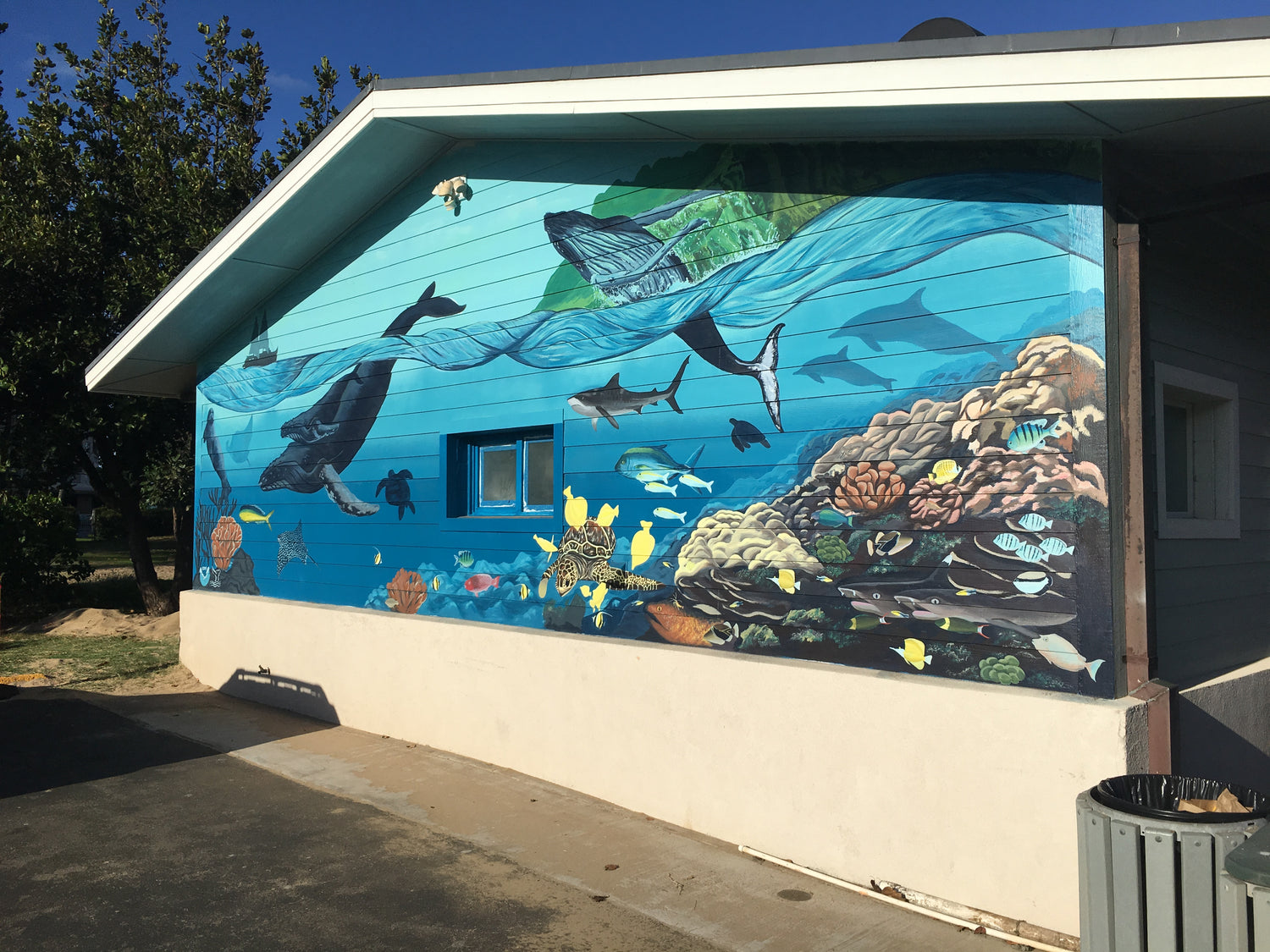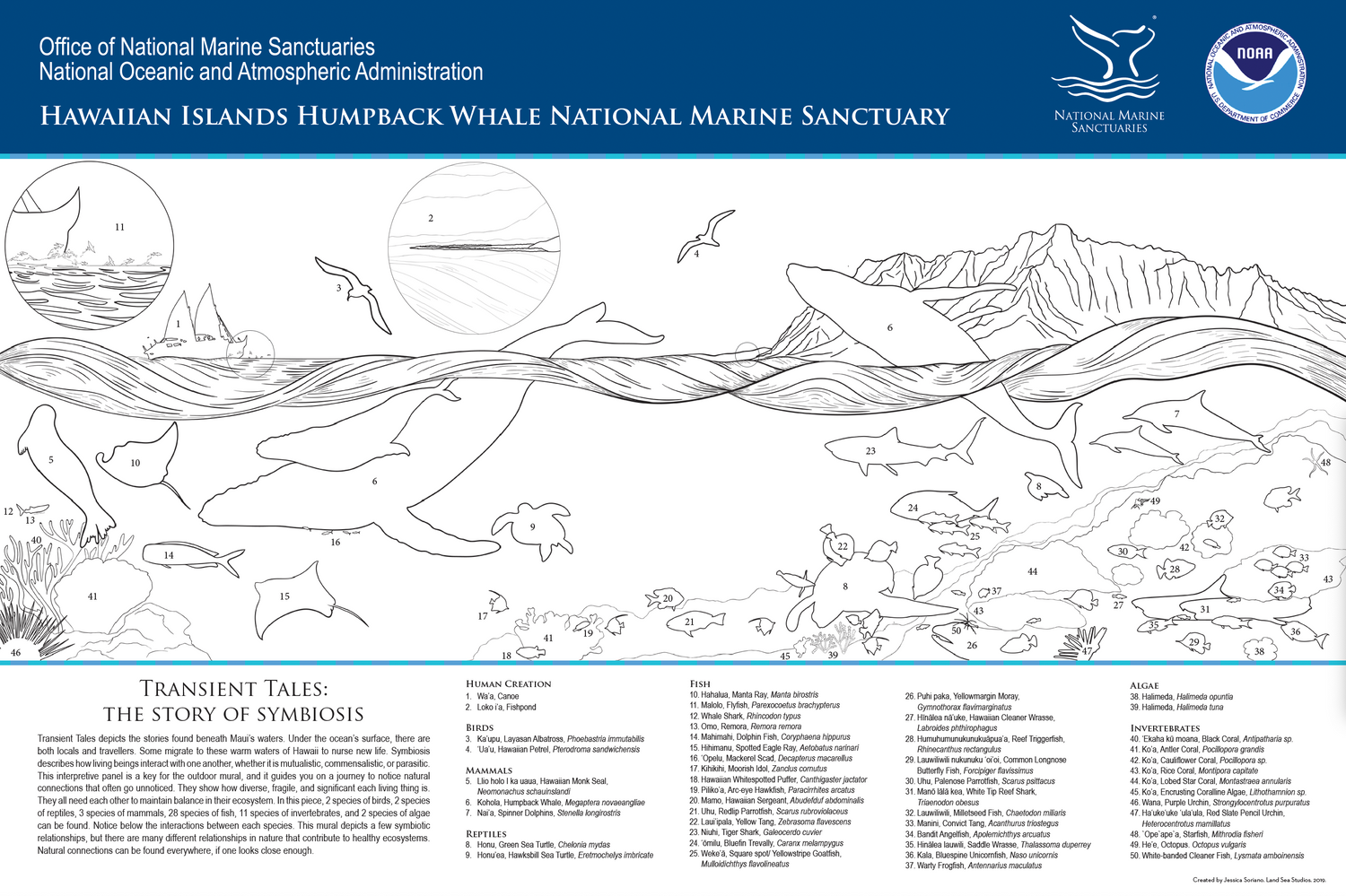 This mural depicts the stories found beneath Maui’s waters. Under the ocean’s surface, there are both locals and travellers. Some migrate to these warm waters of Hawaii to nurse new life. Symbiosis describes how living beings interact with one another, whether it is mutualistic, commensalistic, or parasitic. This interpretive panel is a key for the outdoor mural, and it guides you on a journey to notice natural connections that often go unnoticed. They show how diverse, fragile, and significant each living thing is. They all need each other to maintain balance in their ecosystem. In this piece, 2 species of birds, 2 species of reptiles, 3 species of mammals, 28 species of fish, 11 species of invertebrates, and 2 species of algae can be found. Notice below the interactions between each species. This mural depicts a few symbiotic relationships, but there are many different relationships in nature that contribute to healthy ecosystems. Natural connections can be found everywhere, if one looks close enough.