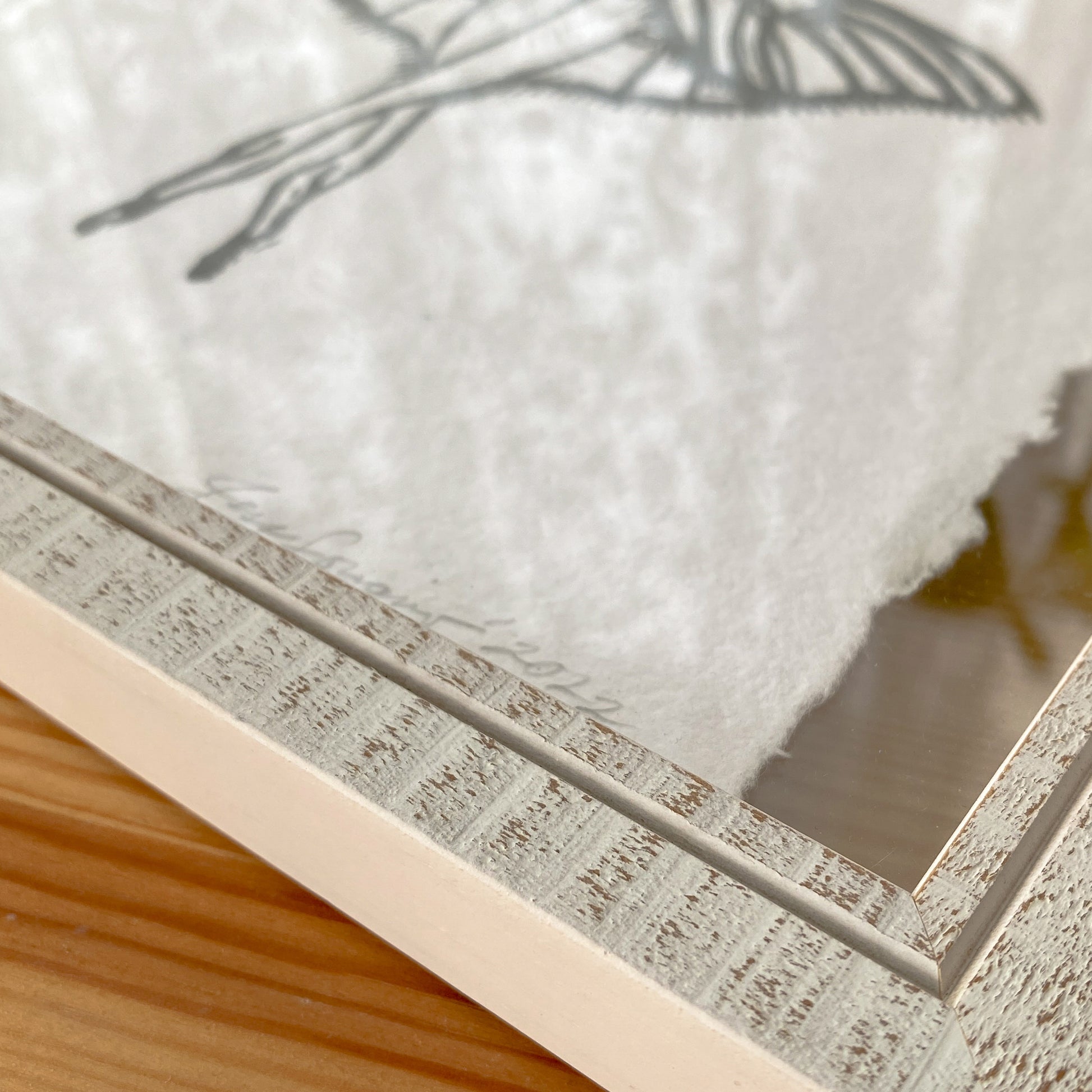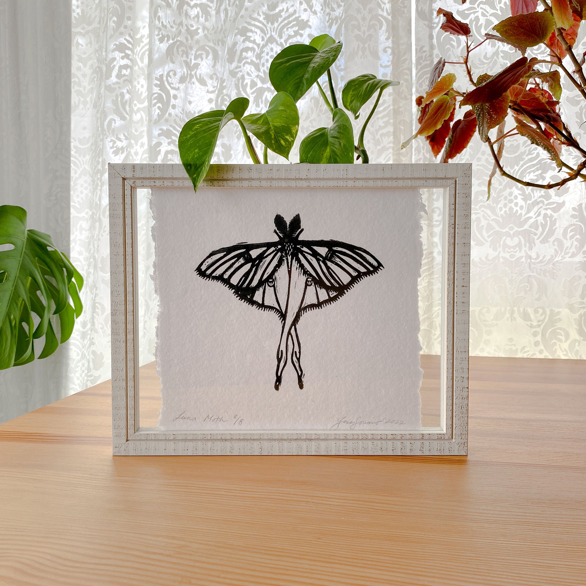 Pressed between two pieces of glass, this original luna moth linoleum print floats, allowing light to shine through the frame and beauty to shine in your home.