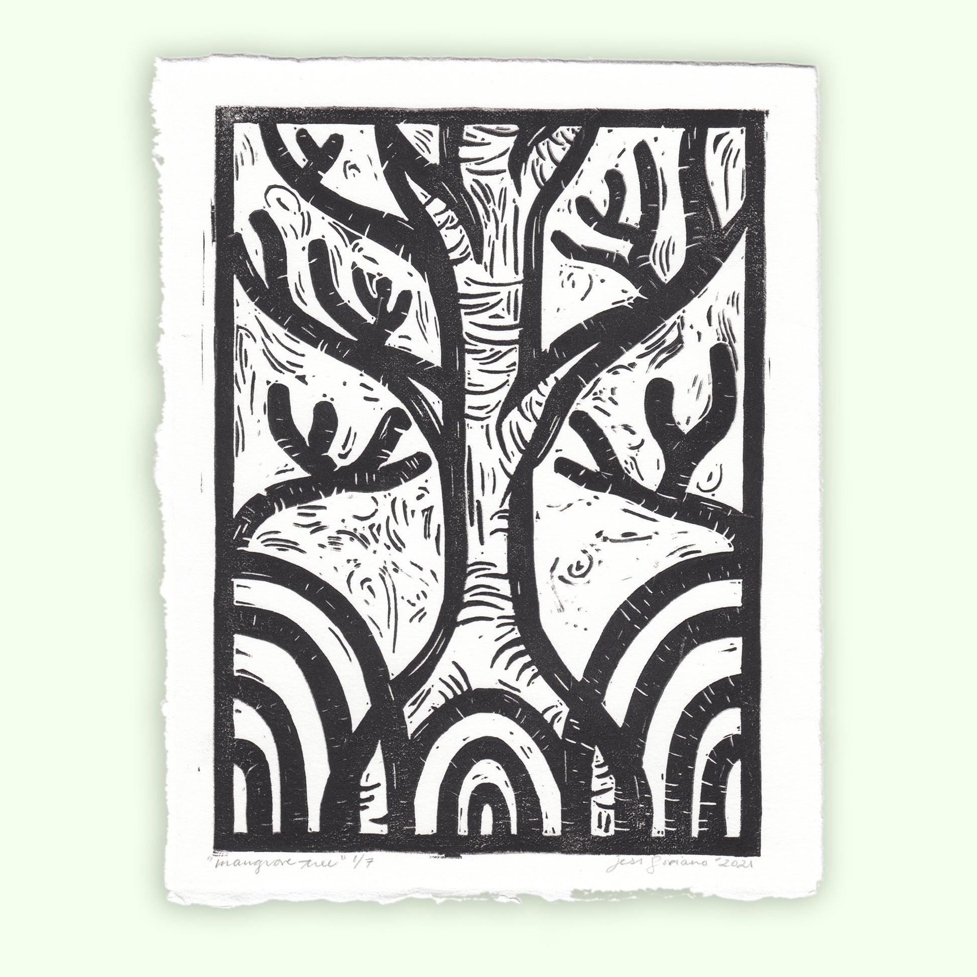 This linocut print is my interpretation of mangrove trees with the way they become this interconnected communal home for all sorts of living beings. They are also so important for protecting coastal communities from hurricanes 🌀 As they protect wild animals by being their home, they also protect us in our coastal communities. Much can be said about these beautiful habitats. Their magical ways of protecting and providing never cease to amaze me. As with my other art, this is available for you 🌱✨