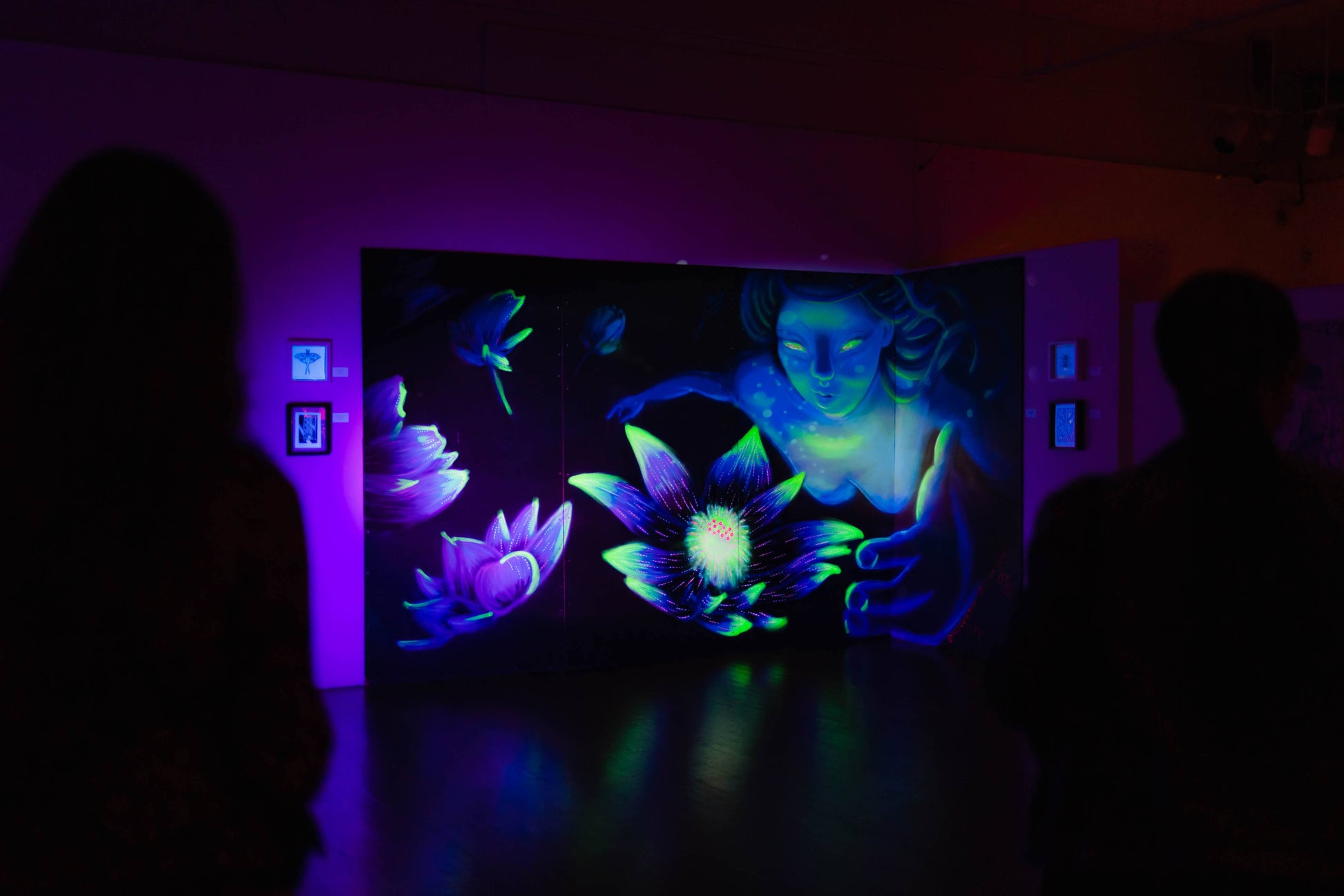 Natalia Corazza and I went out of our comfort zone and experimented with florescent and UV paint. We decided our theme was ‘bioluminescence’ and we made a rough outline, but the colors and details came intuitively while being surrounded by loving energy at the California Roots Music & Art Festival.