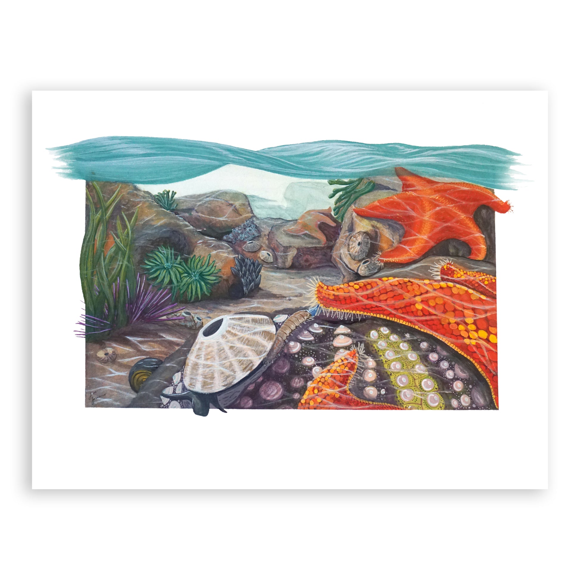 This piece shows the various symbiotic relationships found in rock/tide pools. When the tide is low, creatures become trapped for the time being until the water raises again. During this time, predators come out to hunt, one of them being starfish. As the starfish preys on the snail, under the limpet’s shell, there is a worm that lives with it, and being that the worm would rather live than die, it ends up protecting the limpet from the starfish. Acting as its bodyguard, the worm has a mutualistic relationship with the limpet, where both beings are helping each other survive.
